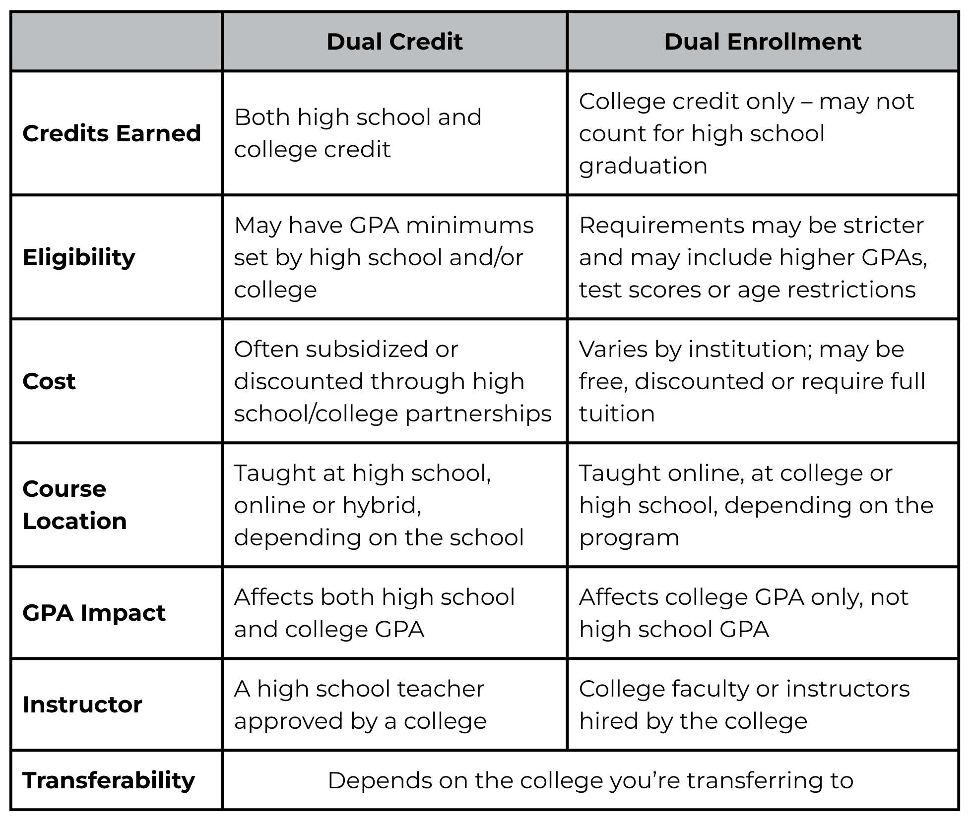 So, which program is the better option? Are you better off taking dual credit courses vs. a dual enrollment program? The answer will depend on your circumstances, but the key factors to consider include: