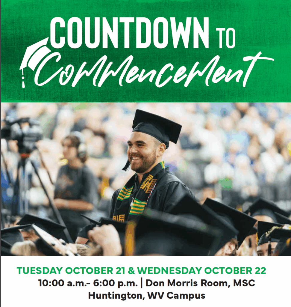 We understand that attending Countdown to Commencement in person may not be possible for all online students. To ensure you have access to important graduation information, we invite students graduating from an E-campus approved program to join the Virtual Countdown to Commencement, hosted by MU Online on Thursday, October 23, from 12 PM – 1 PM. Additionally, If you’re unable to attend live, a recording will be available about a week later at www.marshall.edu/commencement.