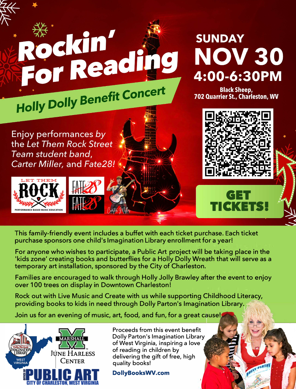 Join us at Black Sheep in Charleston, WV for an evening of music, art, food, and fun, all for a good cause! Proceeds purchase and deliver Dolly Parton’s Imagination Library books to West Virginia children!